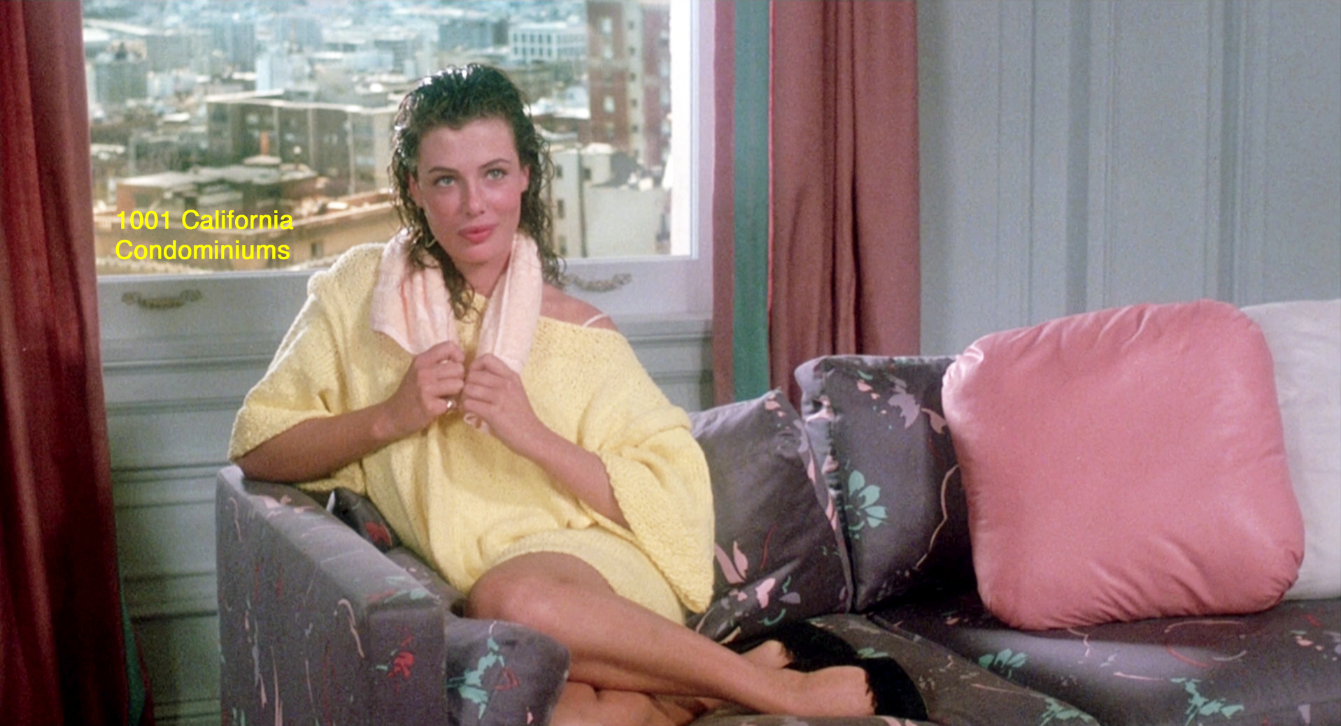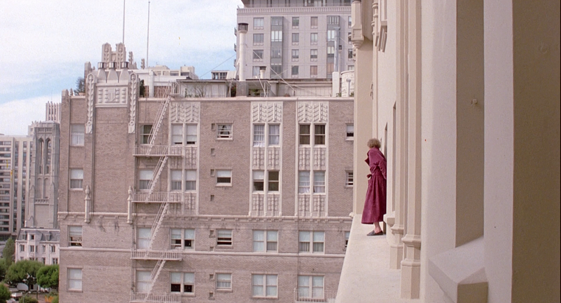 Then … The bedroom scene was filmed in a studio using a photographic backdrop to set the location. Perplexingly though, the photo isn’t a view from a Brocklebank window, instead it was taken from the roof of the neighboring Fairmont Hotel. The building seen on the left beyond Charlotte’s shoulder is the Condominiums at 1001 California Street, the white building to its right is 1055 California and the taller brick building at far right is the Huntington Hotel at 1075 California.