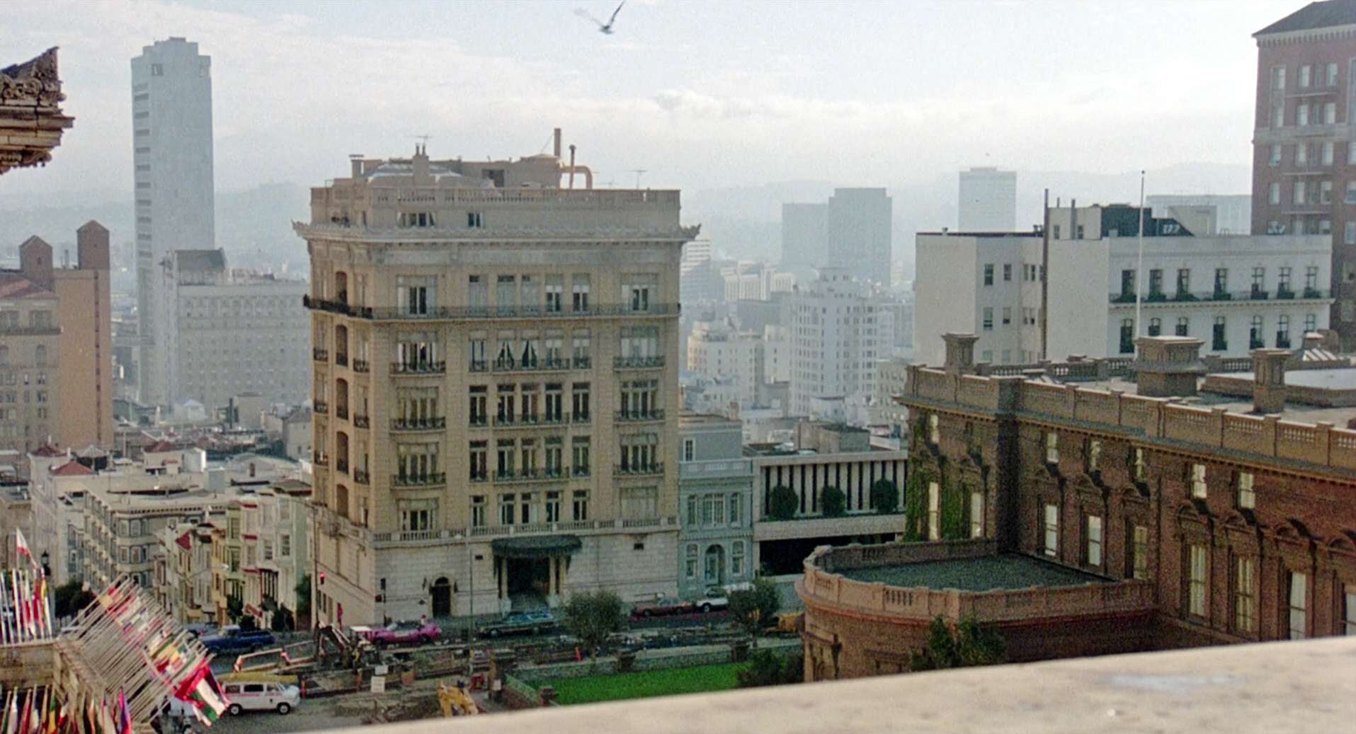 Even more surprising: later on in this scene there’s this view (below) from Charlotte’s window. It shows the Brocklebank’s view of the same three California buildings in the Then image above. CitySleuth would have used this! Down on the left is the international flag array above the Fairmont’s entrance and, on the right, the Pacific Union Club.