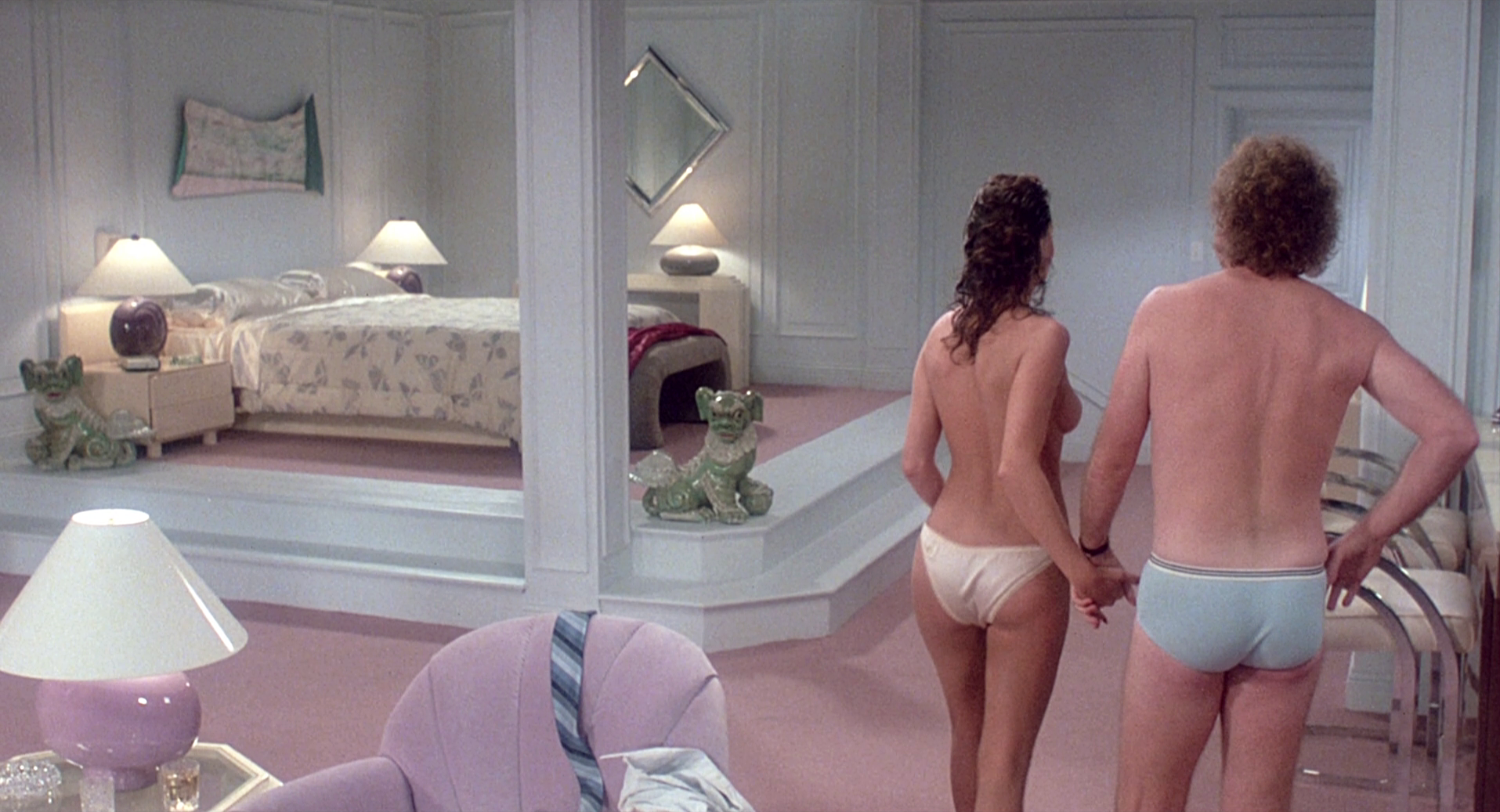My, oh my … she takes his hand and leads him to the bed where she urges him to “Come and get it, cowboy”. This is it! Dreams come true! But hold on … a call from the lobby comes over the intercom from … wait for it … Charlotte’s husband! He’s on his way up!