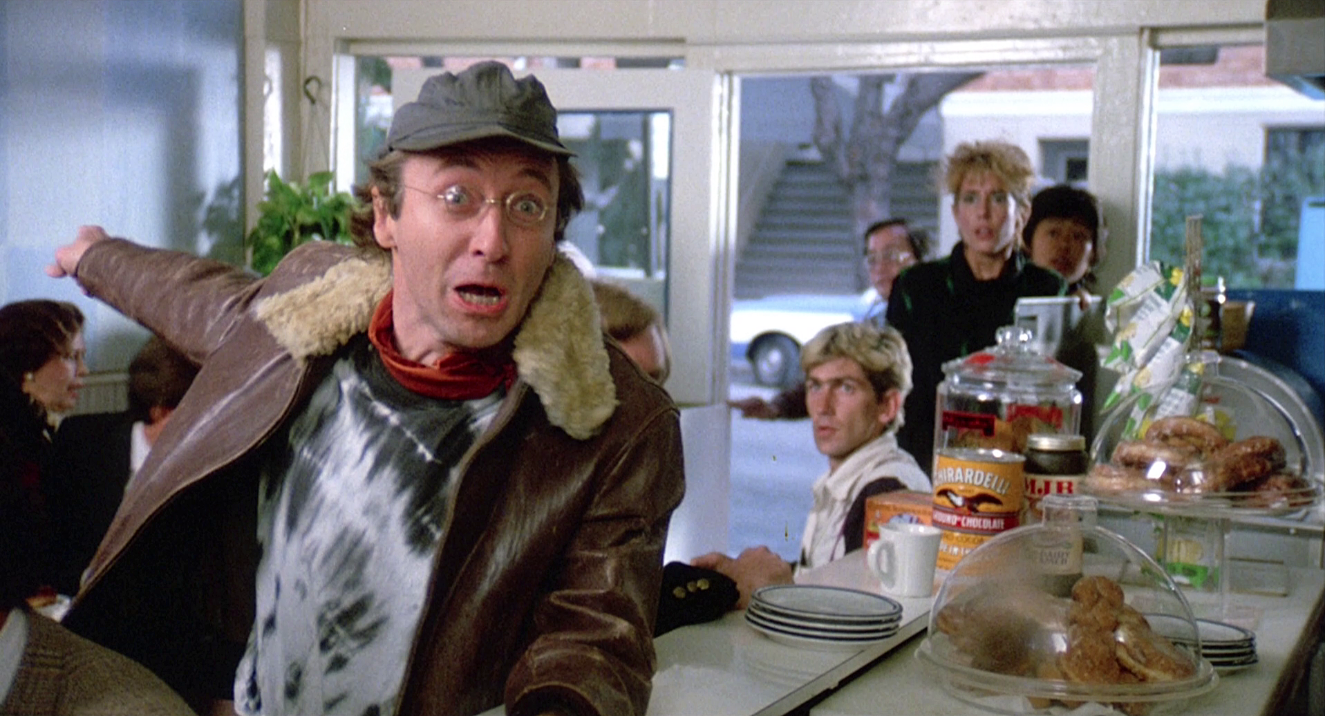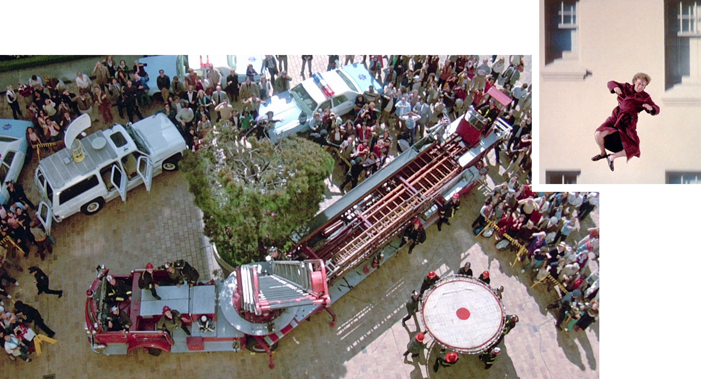 Then … One of the street-side gawkers rushes into a nearby cafe gobbledygooking about a man about to jump - everyone rushes out to join the throng.