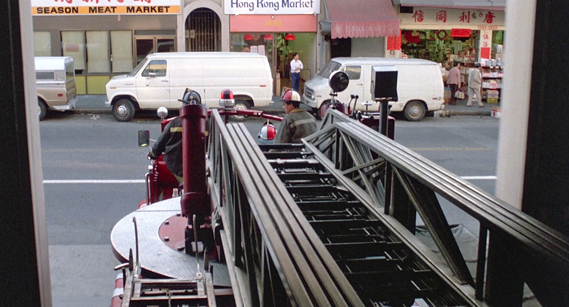 Then … A fire department ladder truck responds to an emergency call. Note the Chinese stores across the way, the clue to this location.