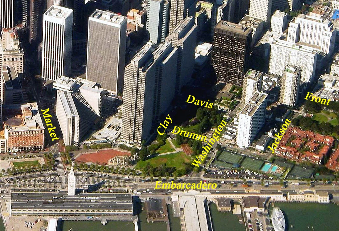 ... and Now, this recent photo shows the highly successful urban transformation of the area since the mid 1960s. The four Embarcadero Center office buildings are lined up along Clay Street and that's the Hyatt Regency Hotel opposite the Ferry Building with its rooftop Regency Club Lounge, formerly the Equinox revolving restaurant but now a stationary lounge-with-a-view for well-heeled hotel guests.