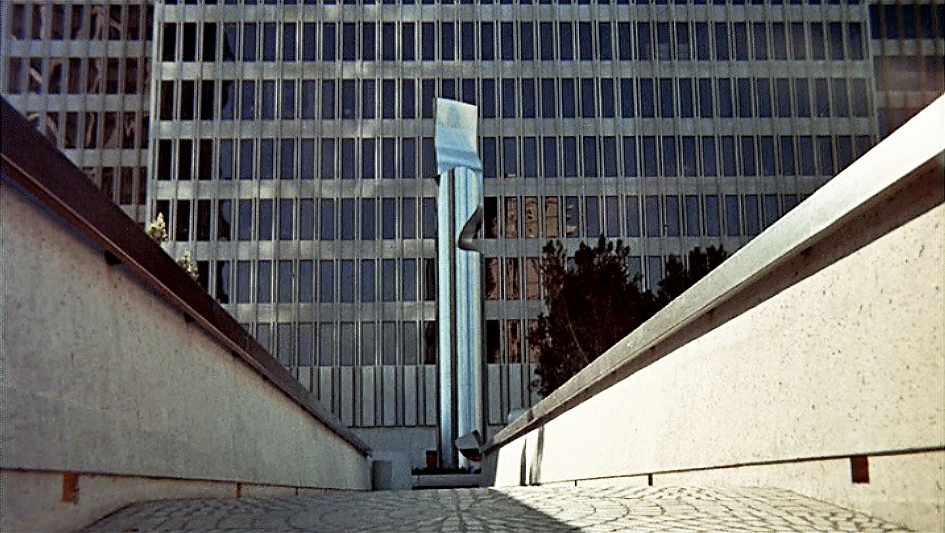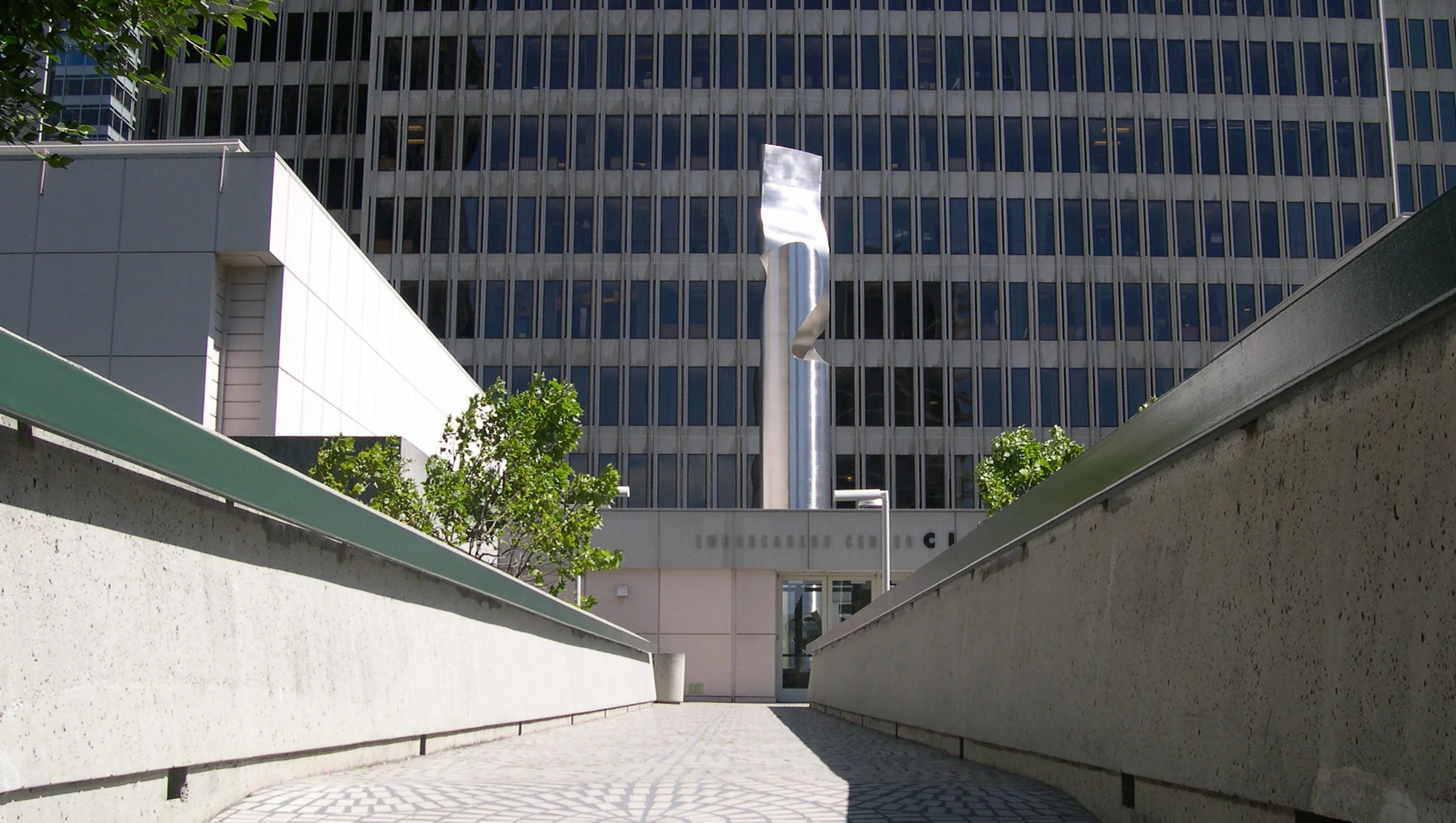Then ... A striking sculpture and imposing office building faces him at the far end of a pedestrian bridge.