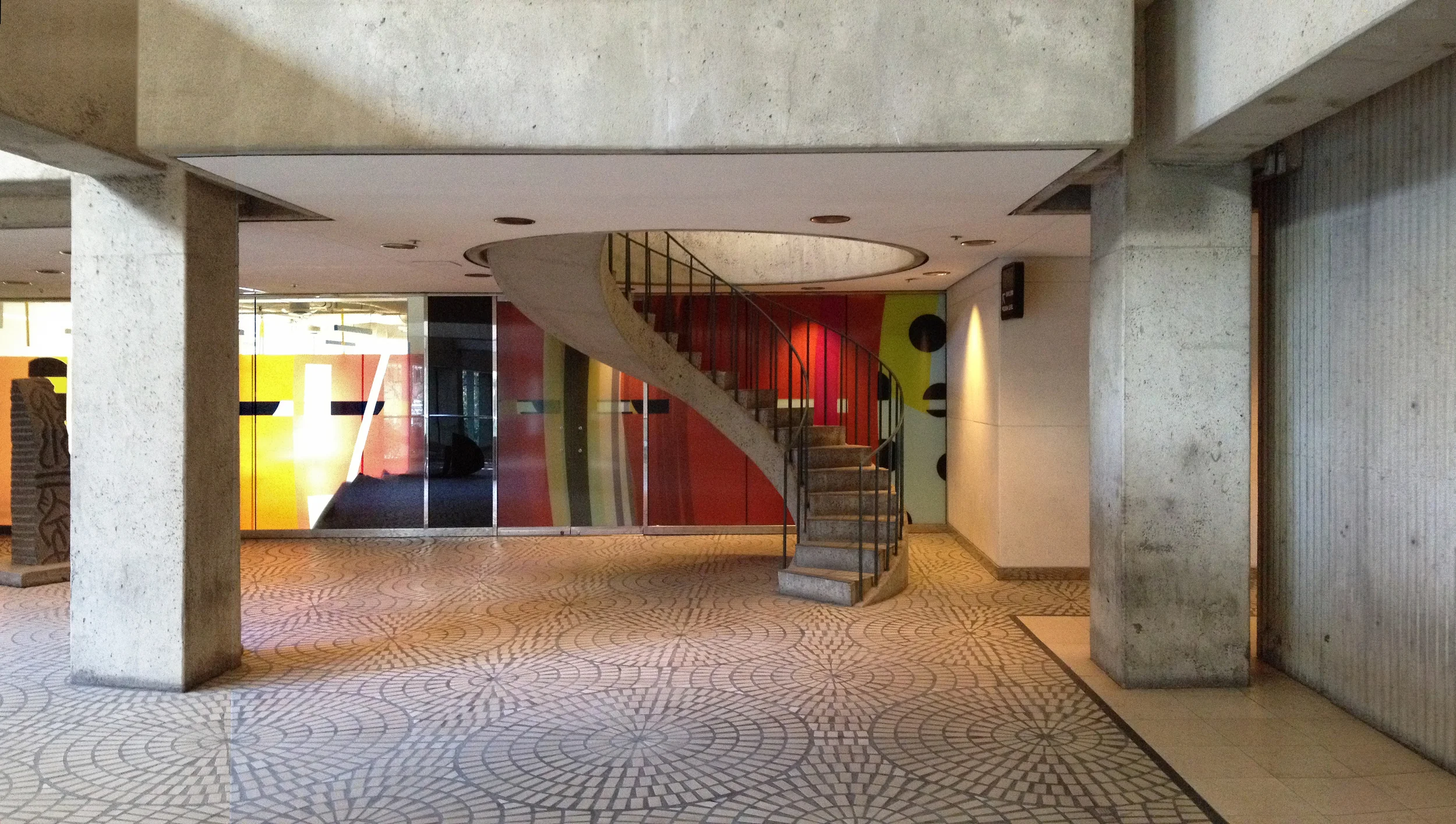 ... and Now, this spiral staircase is at the west end of the lobby level of One Embarcadero Center - with the low walls removed it's now a more open space. The mosaic tiled floor pattern as an architectural feature carries through the public spaces of the entire Embarcadero Center complex, even on the footbridge above.