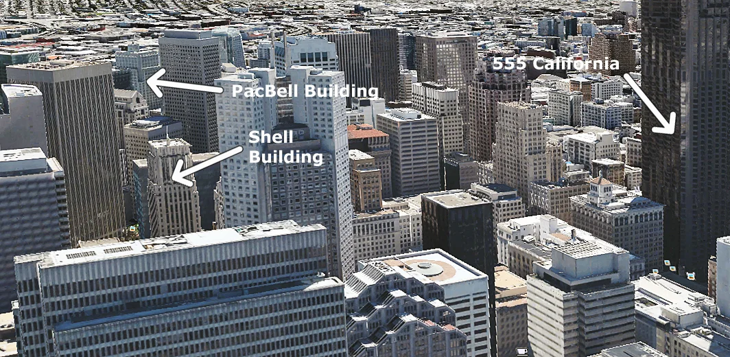 ... and Now, thanks to Google Earth, from a vantage point just above One Embarcadero (in the left foreground below), we can see how that view has changed. Many newer structures now surround those three buildings but they are still there.