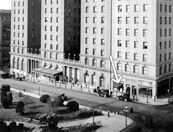 ... a vintage photo ... the arrow in this 1928 image points out the H.L. Ladd pharmacy. But wait ... that's Union Square opposite, there never was any store there, so the scene at the hairdresser's must have been on a studio soundstage with the location implied using video filmed at the corner of the square (map). Now we know.