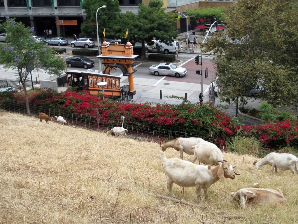 ... and Now, the same view today, with Grand Central Market still there on the left. The view now also includes the Angels Flight funicular, it having been relocated a half block from its original location at 3rd Street. Low-tech grass mowers keep the hillside tidy.