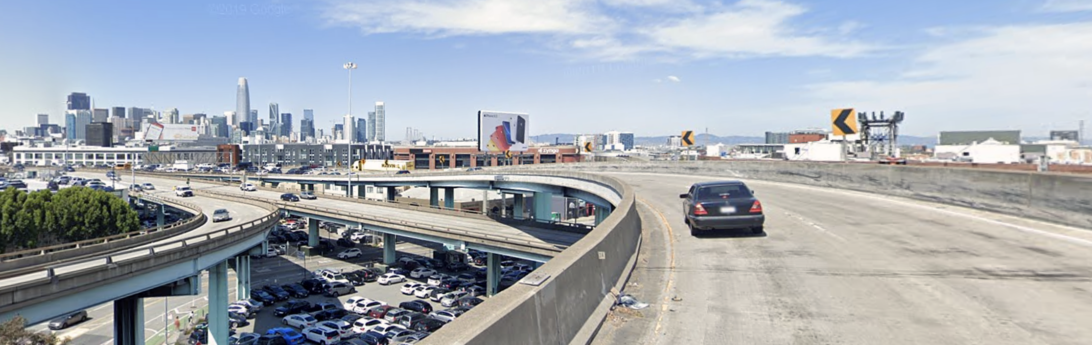 … and Now, the interchange looks very similar today but the cluster that is downtown San Francisco at far left has been transformed. One thing that hasn’t is the huge billboard in the center. The Dunhan, Carrigan and Hayden building is still there at 2 Henry Adams Street, currently housing the San Francisco Design Center Showplace, as too is the rooftop structure that supported the tank seen above (with the DCH Co sign); but the tank is gone; it looks as though an array of antennae has replaced it.