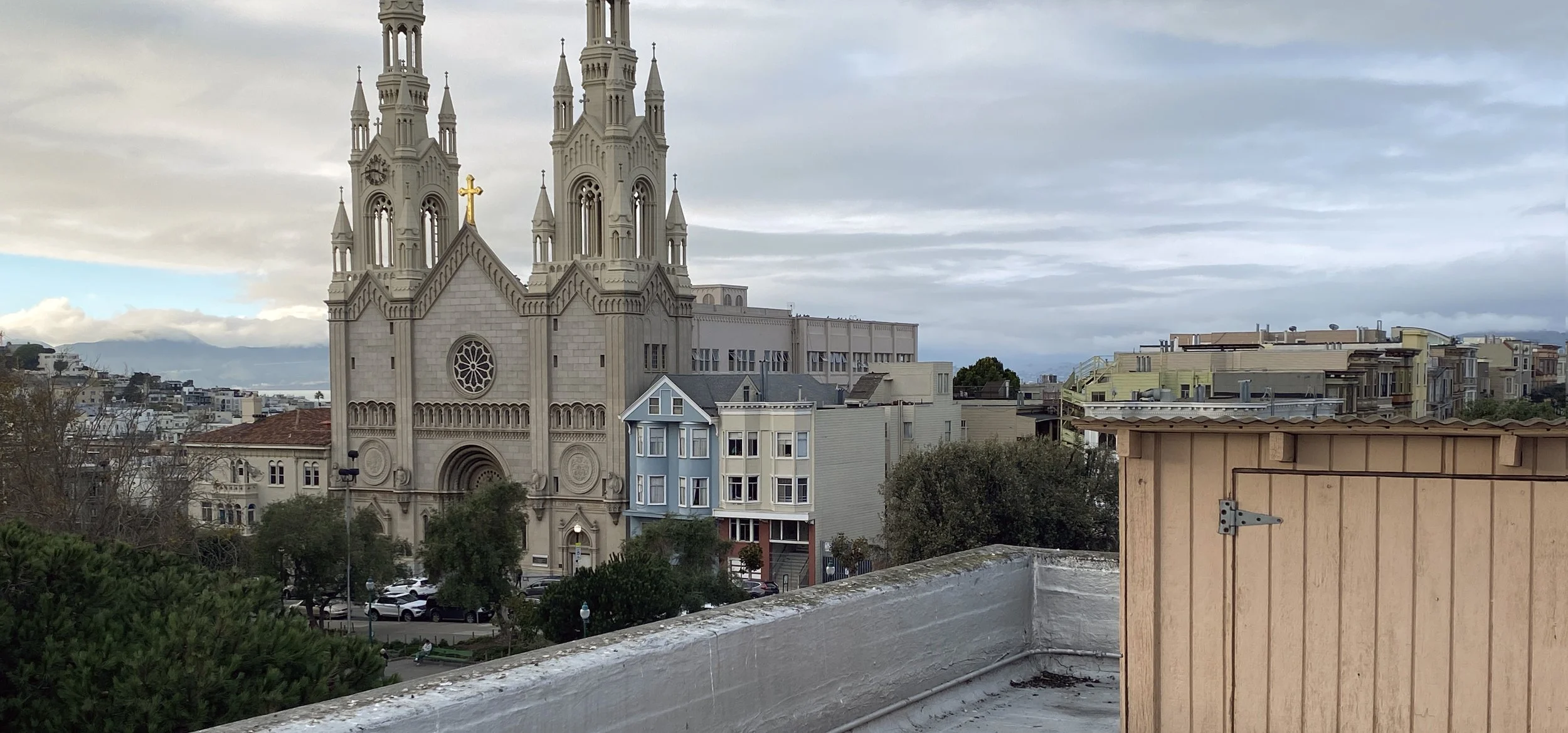 … and Now, here’s the same view today. The first Saints Peter and Paul church stood a block and a half away on the corner of Filbert and Grant from 1884 until 1906 when it was destroyed by the earthquake and fire. The extant church is approaching its centennial - it was built in 1924.