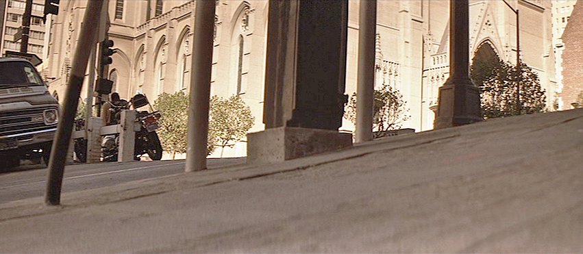 Then … A misty early morning shot from the Huntington Hotel captures the park as Herbert awakens. But note the production goof here: the bench where he slept next to the children’s playground (check it out two Then images above) is missing. The arrow shows where it should have been.