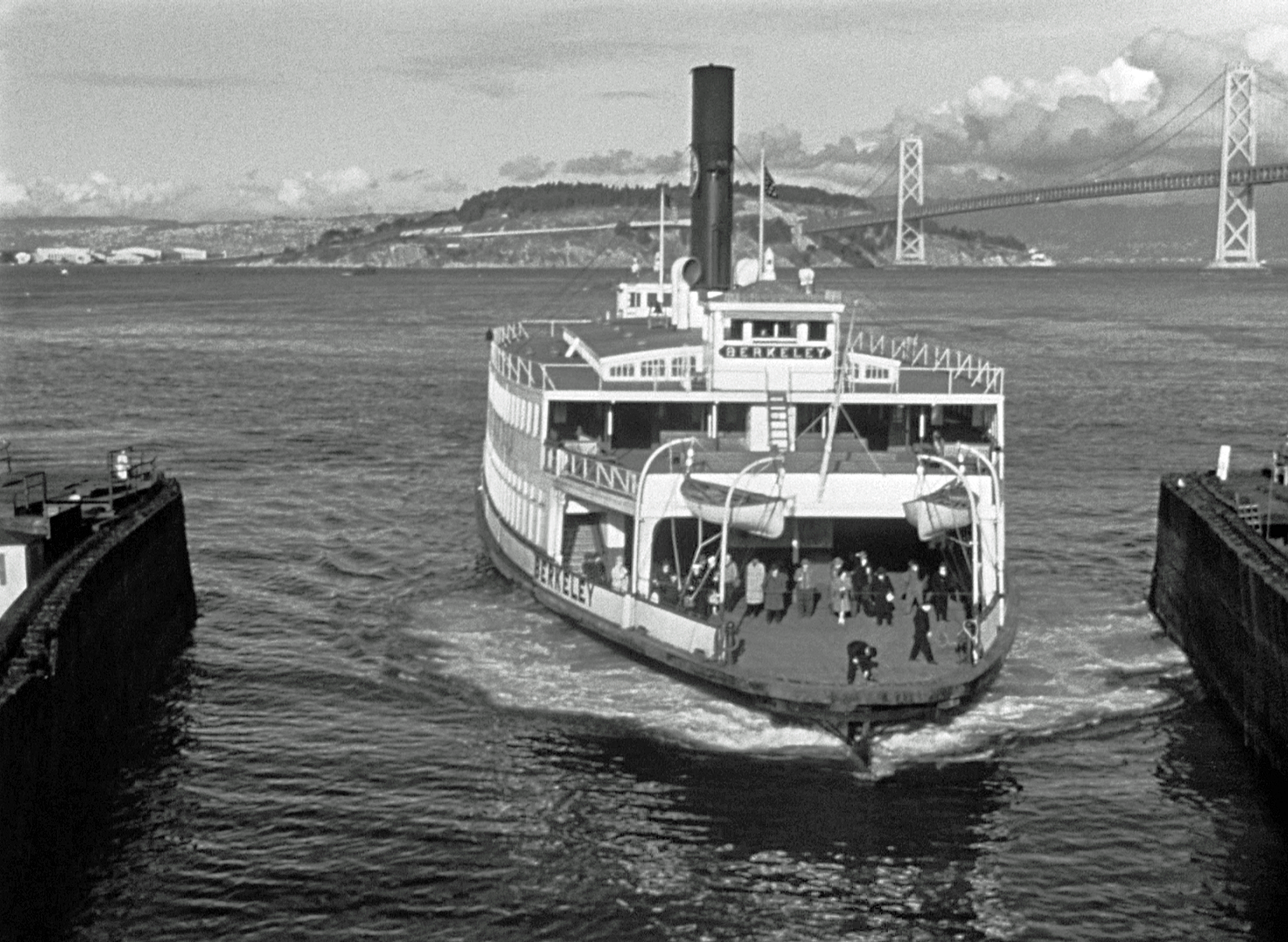 Then … The Bay Bridge and Yerba Buena Island are again seen in the background as the Southern Pacific Railroads’ ferryboat Berkeley (it linked San Francisco with the Oakland Pier trains across the Bay) approaches the Ferry Building. On board is a suspect being brought back to face trial for murder. Long since retired from service, this historic steam ferry today resides as the centerpiece display at the San Diego Maritime Museum.