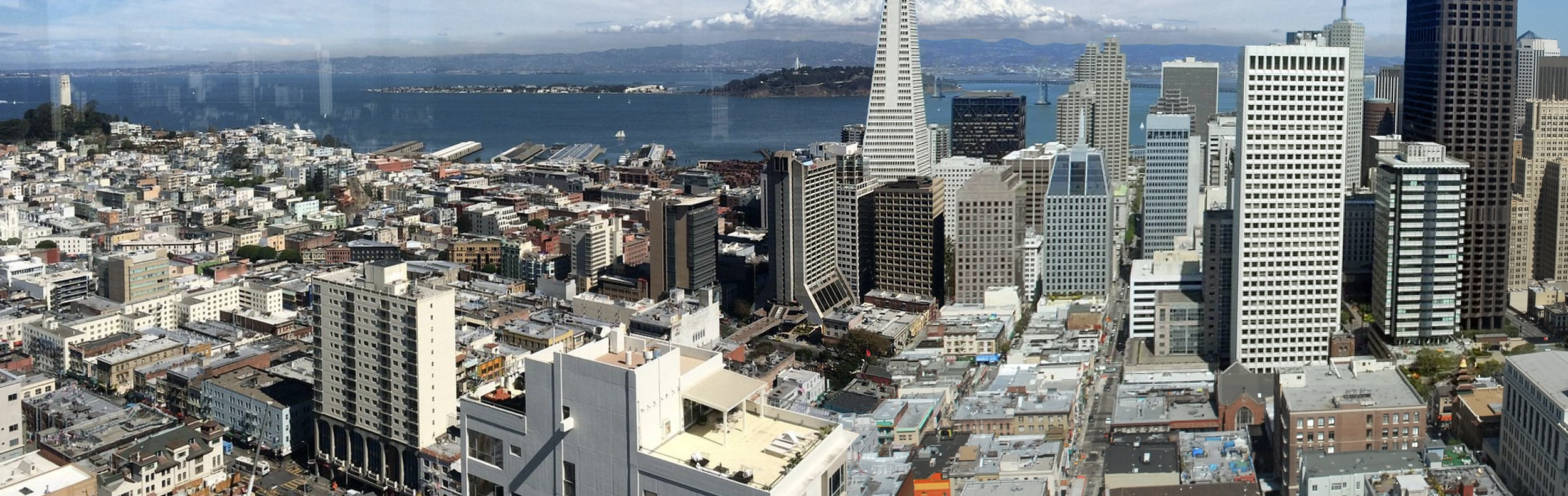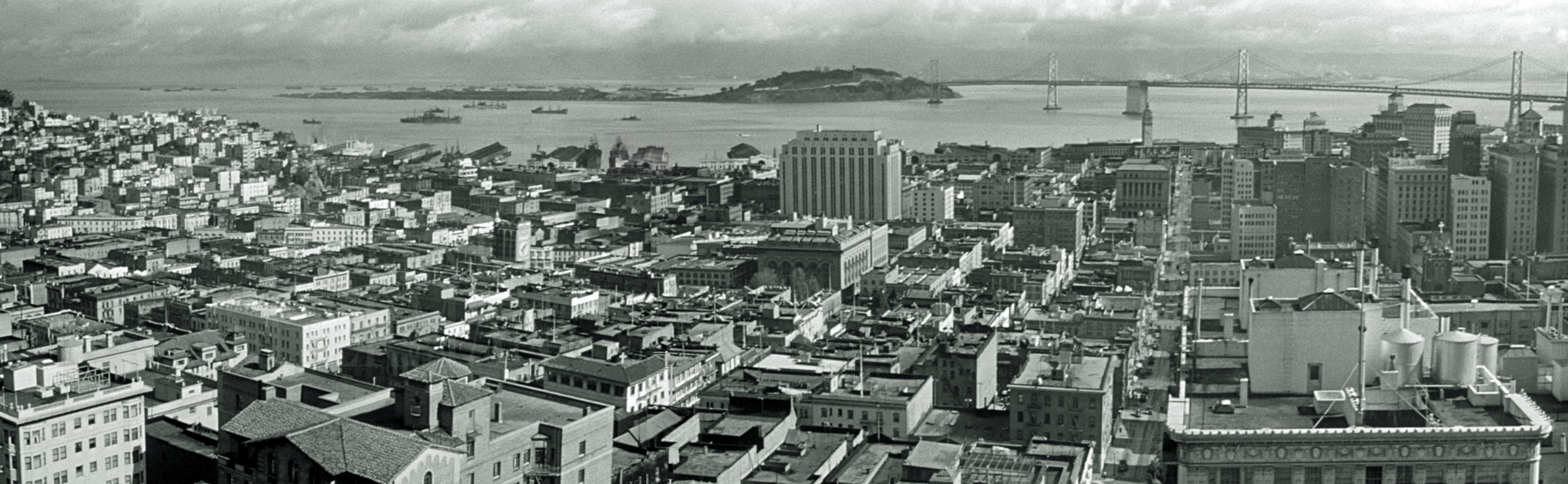 … and Now, the identical panorama taken from the same rooftop spot today would have most of the left half blocked by the 29 story Fairmont Tower added in 1961-62 but this 23rd floor view from that Tower is a good substitute. Much of Telegraph Hill over to the left is unchanged but the Financial District straight ahead has been transformed. From here one still sees part of the Russ Building at far right.