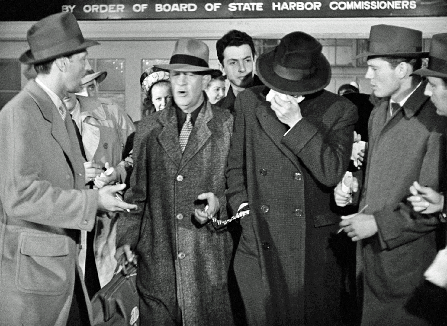 A group of reporters bombard him with questions as he passes through a waiting room. According to The IMdB Pro website the SF Chronicle’s beloved Herb Caen (he would have been 30 at the time) was one of them, if so he would be the hatless one behind the suspect.