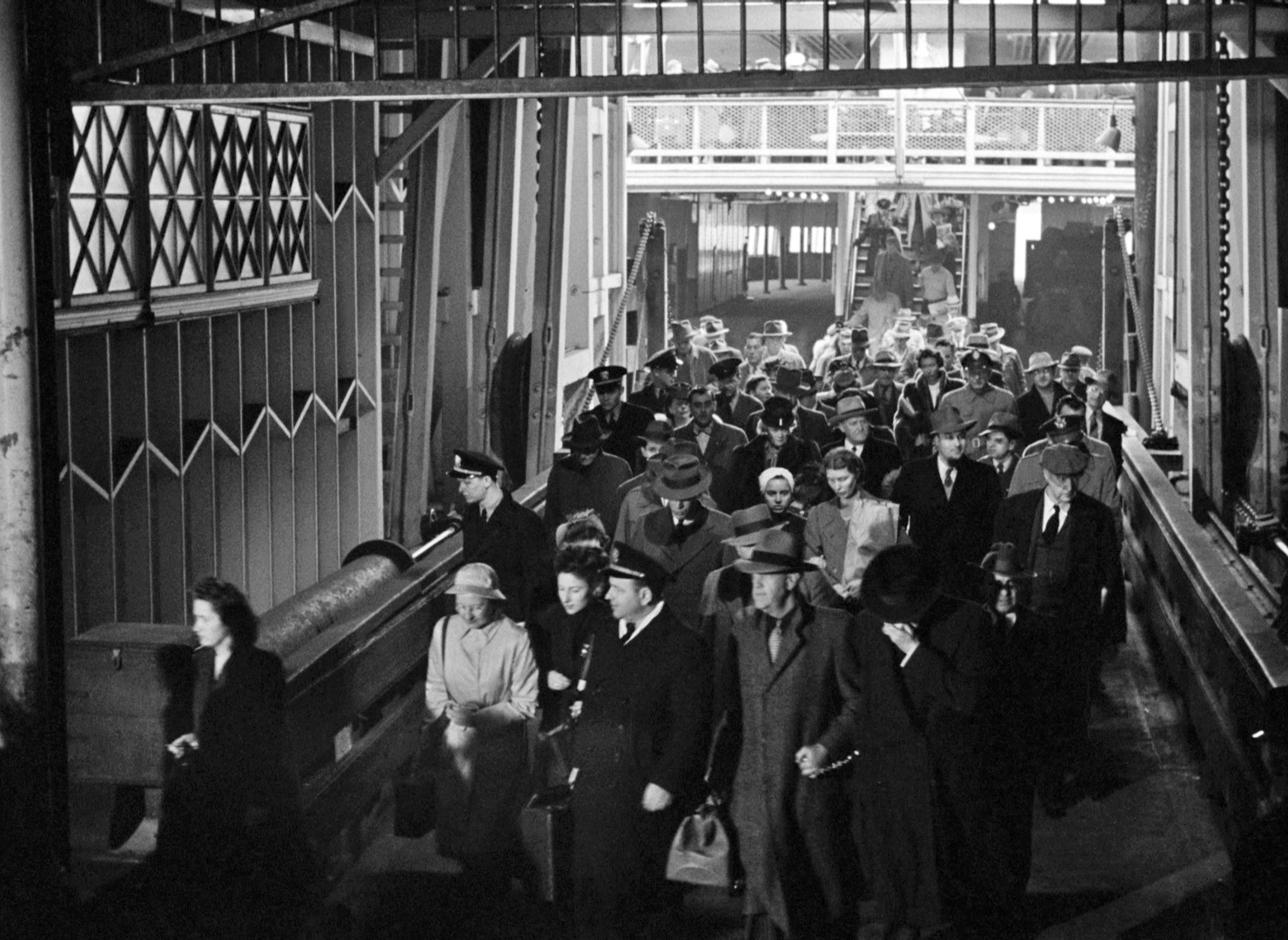 The ferry passengers exit through the Ferry Building, here walking down from the second level to the gangway. At the front the suspect, escorted by a police guard, keeps his head down and face covered. This part of the building is completely changed, it’s now office space.