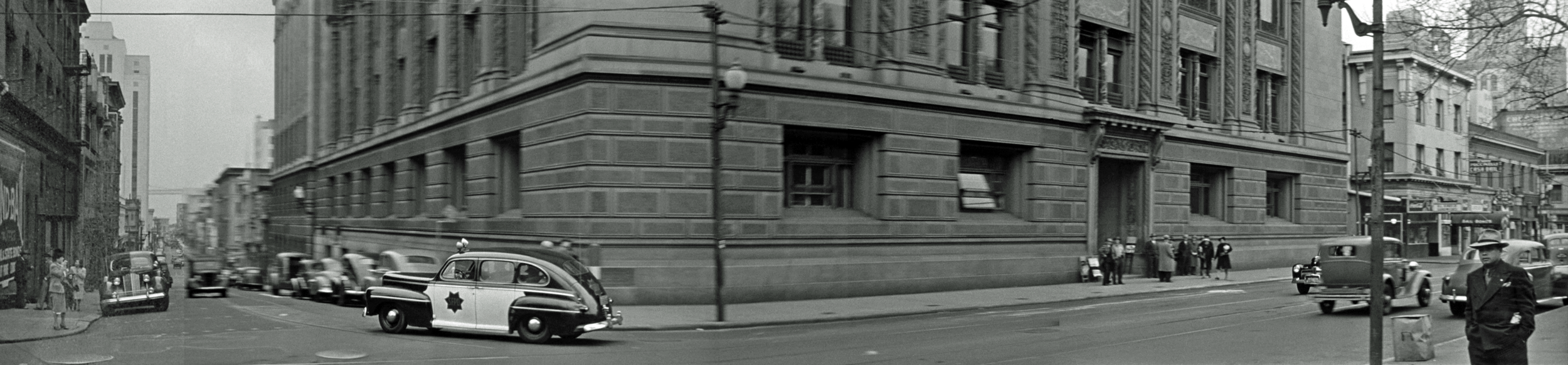Then … The police car arrives at the imposing Hall of Justice at 750 Kearny Street where Chinatown meets the Financial District.