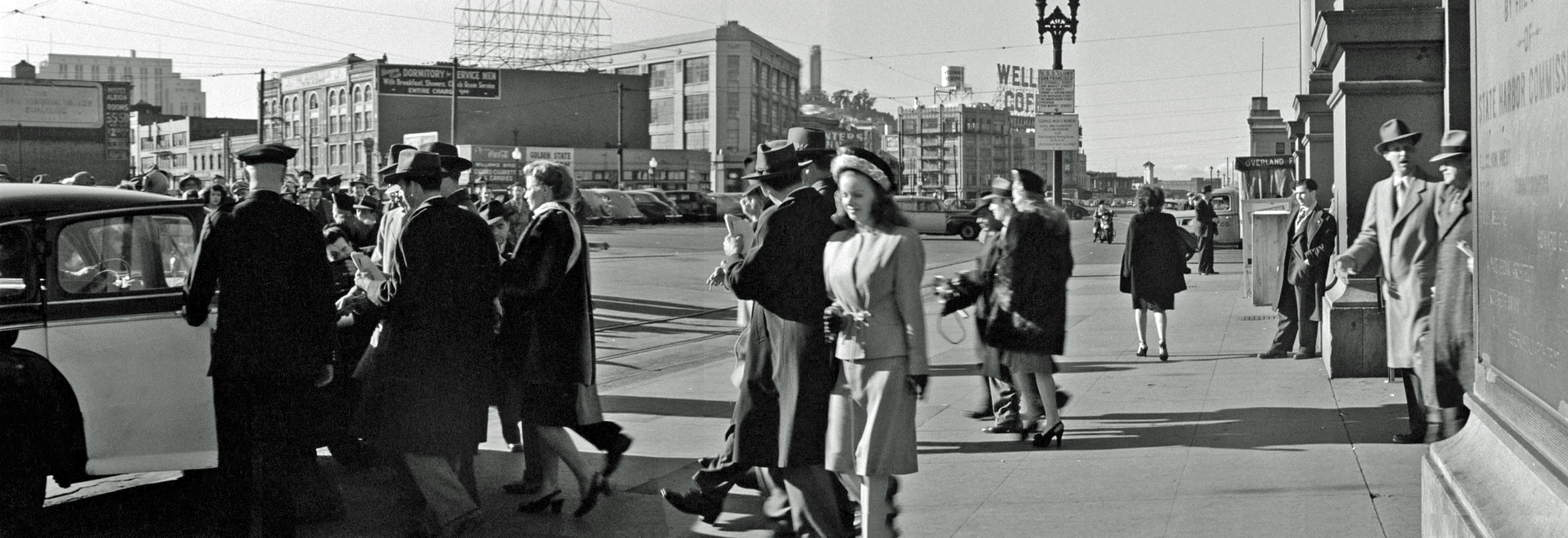 Then … Outside the Ferry Building on the Embarcadero the reporters continue to hound him until he is bundled into a waiting police car. Recognizable structures from left to right are: the Appraisers Building (even more visible in the opening panorama at the top of the post), the Ferry Station Post Office on Merchant Street, Coit Tower and the Wellman’s Coffee building.