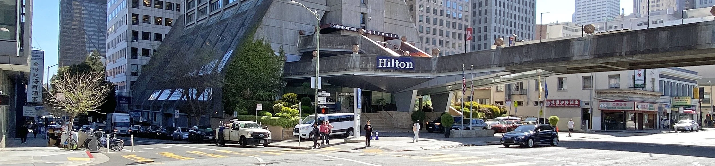 … and Now, The Hall of Justice moved from here to new headquarters on Bryant Street in 1960. A decade later a hotel - the Holiday Inn Hotel Downtown - was built on this site. In 2005 it was taken over by the Hilton chain, refurbished and renamed the Hilton San Francisco Financial District. Here it is today, including the so-called ‘Footbridge to Nowhere’ which spans Kearny Street to Portsmouth Square but is never used. (There are plans afoot to remove it).