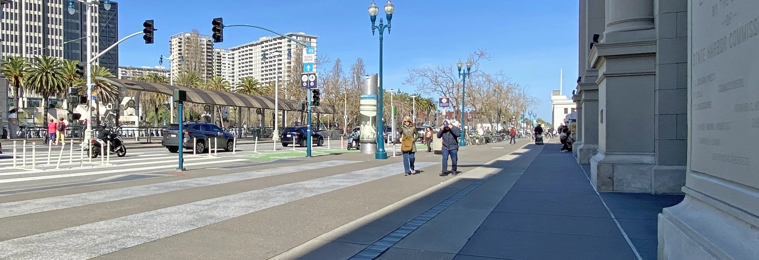 … and Now, the Embarcadero is much changed today; the buildings lining the street above have been replaced by the Embarcadero Plaza, Sue Berman Park and the Bay Club Gateway Tennis and Swim complex (clearly shown in the Then and Now aerial above). Coit Tower is still there but partially blocked by the double-globe lamppost in the center. The office high-rise at far left is Four Embarcadero Center.