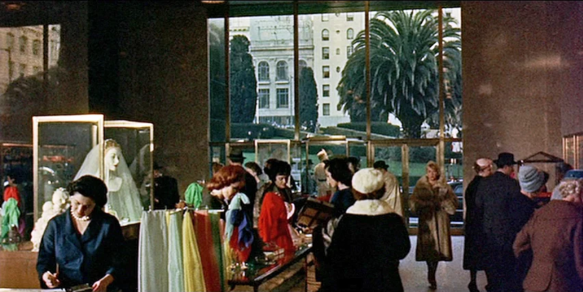 ... a vintage photo ... this early 1960s postcard pictures the block on Geary as it was when the movie was filmed. I. Magnin's is the tall white building left of center and to its right is Blum's and Macy's Geary street entrance (its main building is behind it on O'Farrell) and Dohrmanns department store is further along. The City Of Paris store with its rooftop Eiffel Tower is at far left across Stockton Street.