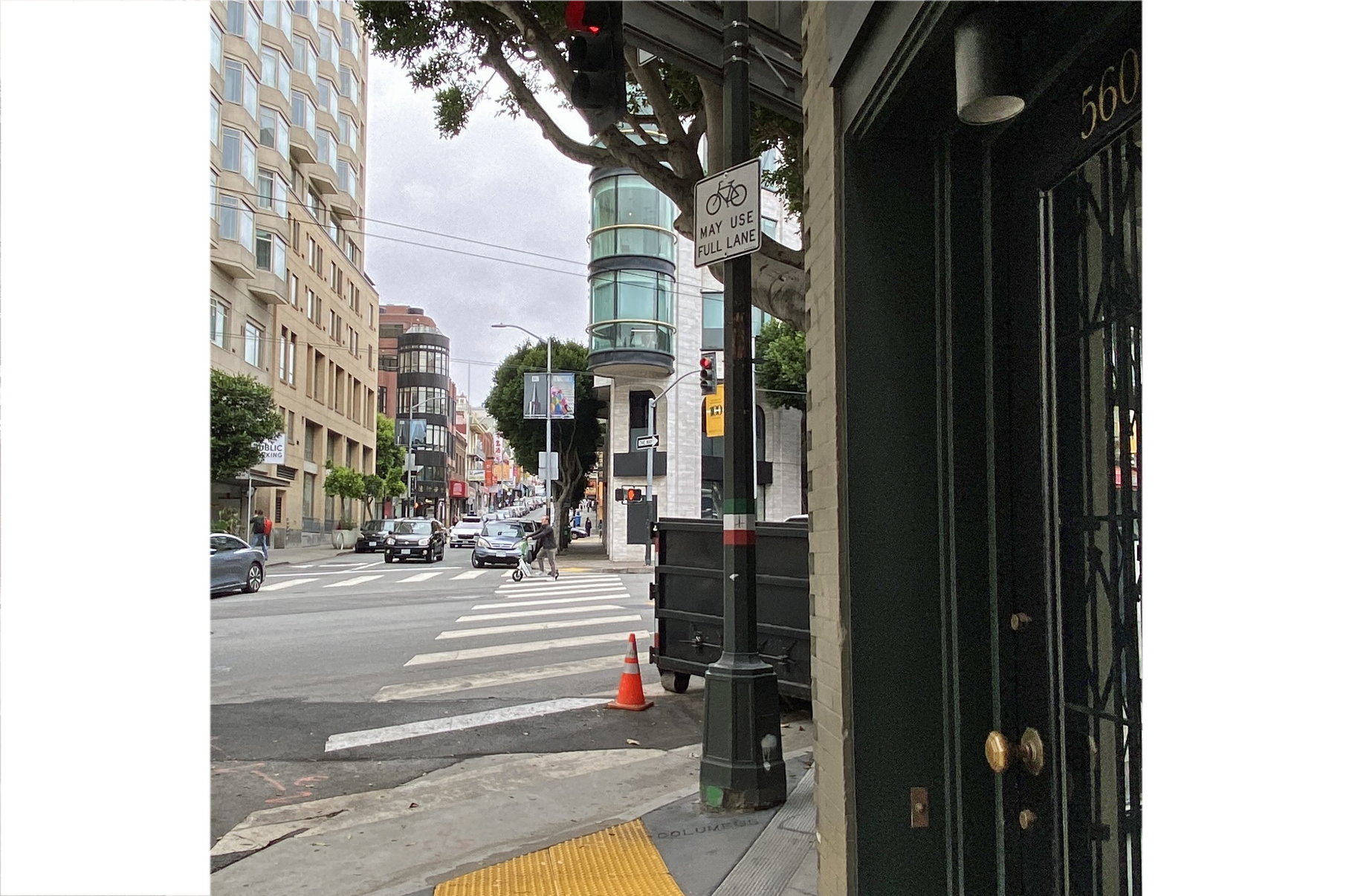 Then … Teddy drives home, here crossing Montgomery Street heading east on Union. But locals viewing this will have a good laugh …
