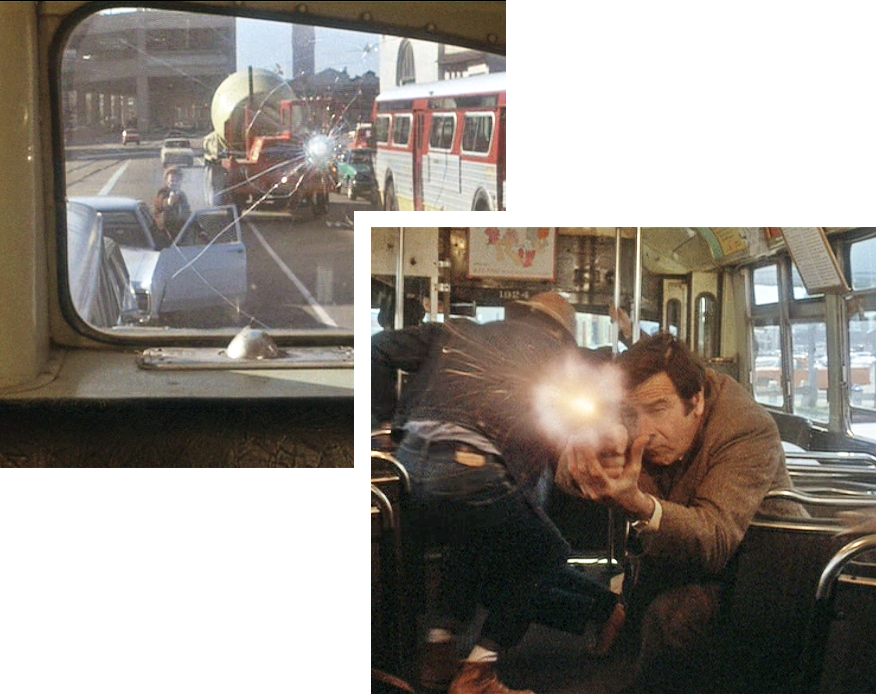 Then ... Several folks at a bus stop on the Embarcadero await the oncoming bus carrying Jake and the suspect. Piers 16 and 18 are over to the right and the Ferry Building is visible in the distance. The abrupt termination of the Embarcadero Freeway left of center suggests there was a southern extension planned.